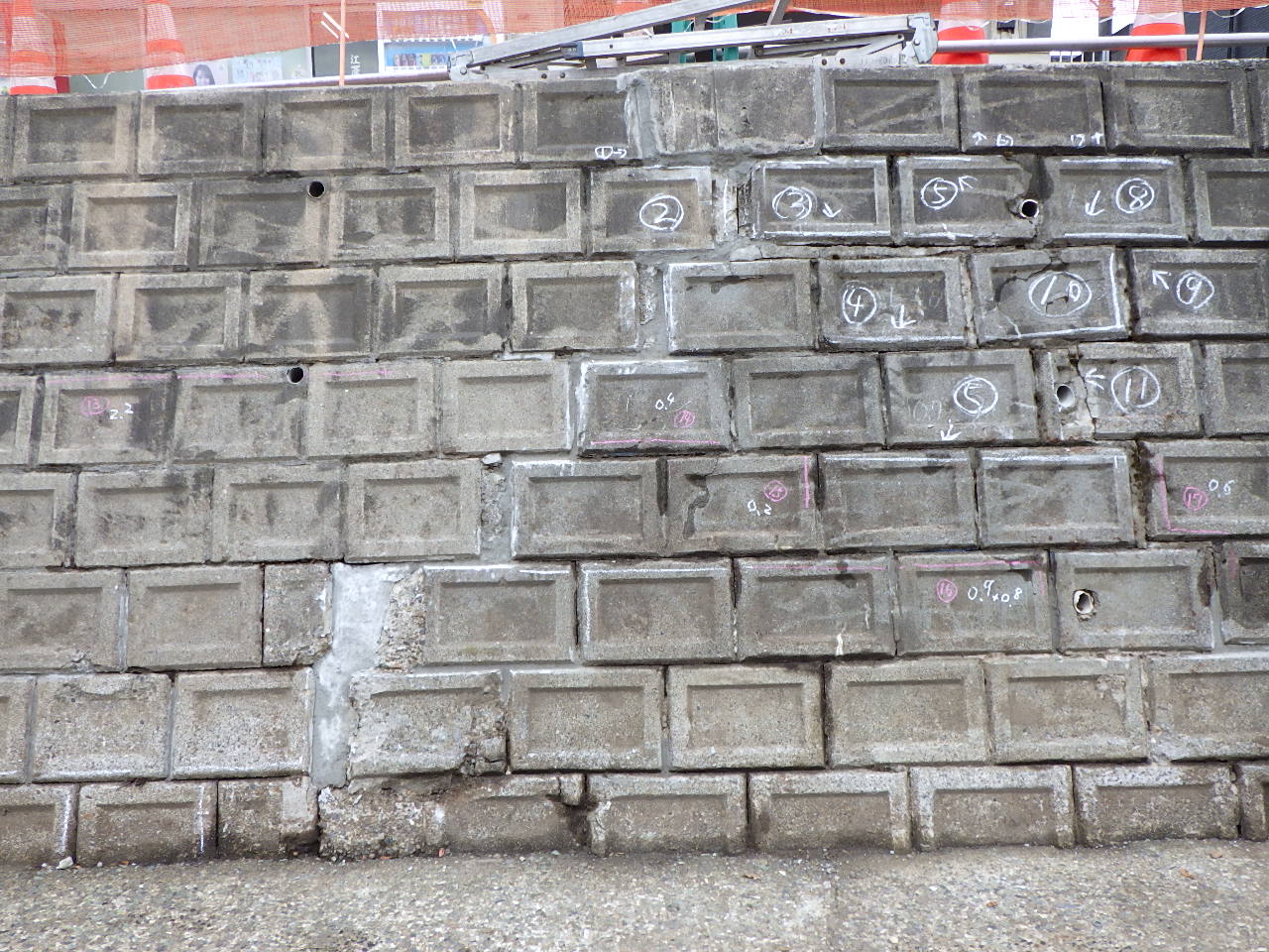 - 埼玉県富士見市発注物件で河川補修工事の1次請けとして元請様より受注頂きました。工事内容は、ひび割れ補修工(低圧エポキシ注入工法:SKグラウトプラグA工法)15m、欠損補修工(エポキシ樹脂モルタル充填工法:ザインSP-L工法)2か所です。設計図面を基に1月22日現場調査に赴きました。現地を確認したところ、設計図面以外の追加補修部が確認でき報告書としてまとめて発注者様&元請様と打合せ、最終的にはひび割れ補修工約50m、欠損補修工6箇所となりました。ブロックの隙間幅が大きいことより注入するエポキシ樹脂はシーカ・ジャパン社製エバーボンドEP-100(高粘度形/グリス状)を使用しました。工事は、雨天になると増水することより天気を確認しながらとなりましたが、工期中に無事完工しました。