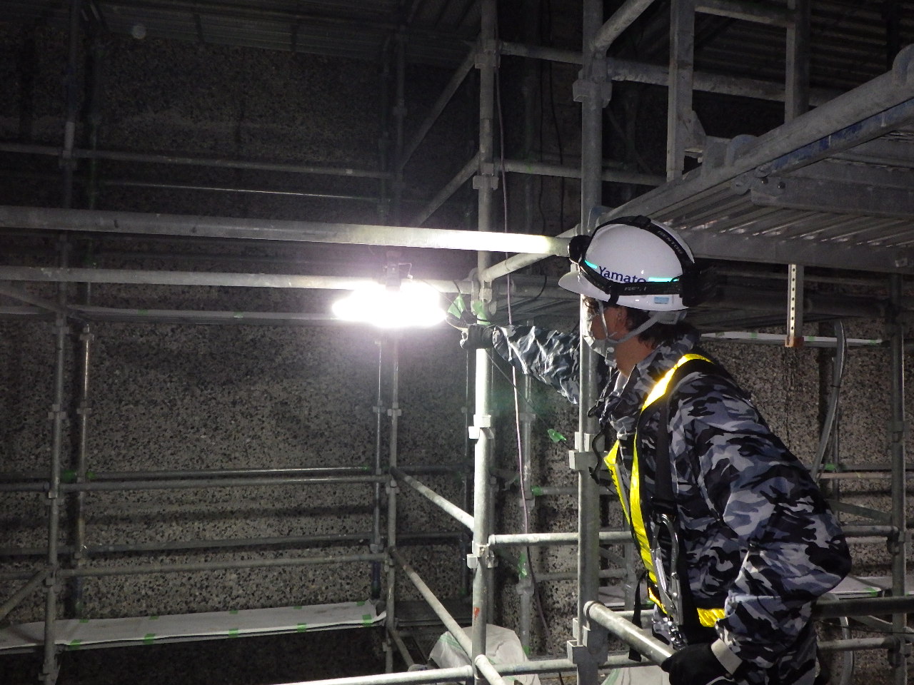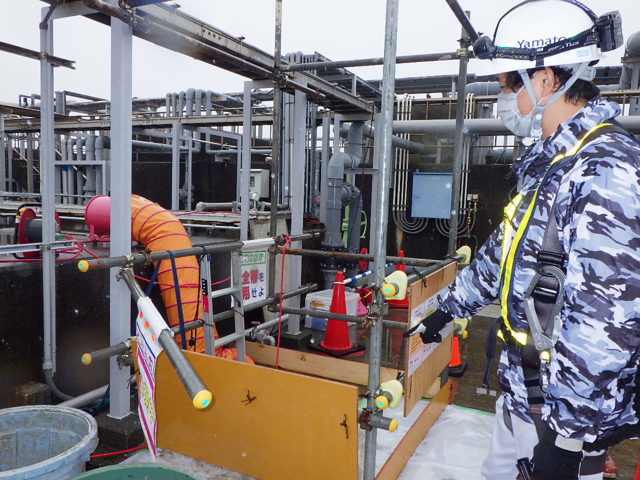 - 施工概要は、汚水処理施設の防食工事1,444㎡と外壁塗装工事1,550㎡です。防食工事は、超高圧による劣化部除去、耐硫酸モルタル(住友大阪セメント(株)社製リフレアークL)で断面修復します。流量調整槽 はD種対応(シーカ・ジャパン㈱社製マスターシール7000CR)の塗布型ライニングを行います。外壁塗装工事は、清掃(15Mpa以下の高圧水洗)、素地調整(三種ケレン)、塗装(大日本塗料㈱社製EXTRAアクアフッ素)で施工してます。工期は、令和7年1月~令和7年12月です。安全パトロールは、月に1回行っています。S専務の目が光り、いくつかの安全に対する是正が現場で進んでいます。弊社は、「安全はすべてに優先する」を信条に事業に取り組んでいます。